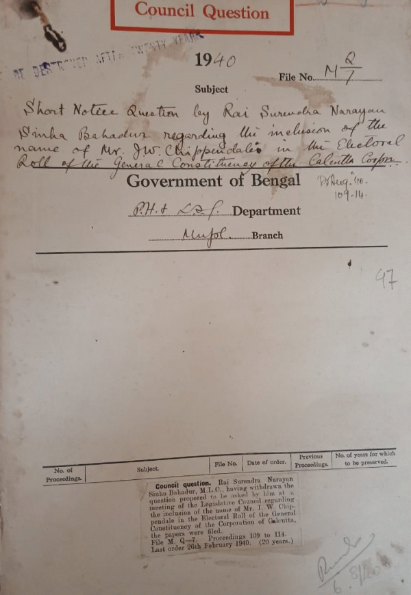 Short Notice Question by Rai Surendra Narayan Sinha Bahadur regarding the inclusion of the name of Mr J.W. Chippendale in the Electoral Roll of the General Constituency of the Cal. Corporation.