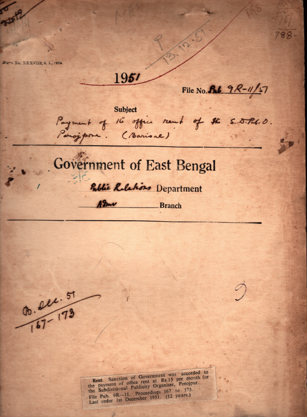 | Rack No. 18, Bundle No. 03, SI No 191 Amendment to the B.S.R. post 1 &11. | Rack No. 18, Bundle No. 03, SI No 217 Issue of instruction of D.M. Unit Noakhali to worked at Feni. | Rack No. 18, Bundle No. 03, SI No 218 Arrangement for drawing one increment of pay of Maulvi Abdul Mahmood from 12th September 1947 was made with the Accounts Branch. | Rack No. 18, Bundle No. 03, SI No 219 Payment of the officer rent of the S.D. Pub, O, Perojpur. | Rack No. 18, Bundle No. 03, SI No 220 Rent for the office of the District Publicity Organizer, Dacca was sanctioned at the rate of Rs. 36-14 per month. | Rack No. 18, Bundle No. 04, SI No. 231 Supply of Newspapers at the residence Honorable Prime Minister ( Mr. Nurul Amin) | Rack No. 18, Bundle No. 04, SI No. 232 Fixation of Stationery grants of all this offices under this govt, for the Year 1948-49 and 1949-50. |