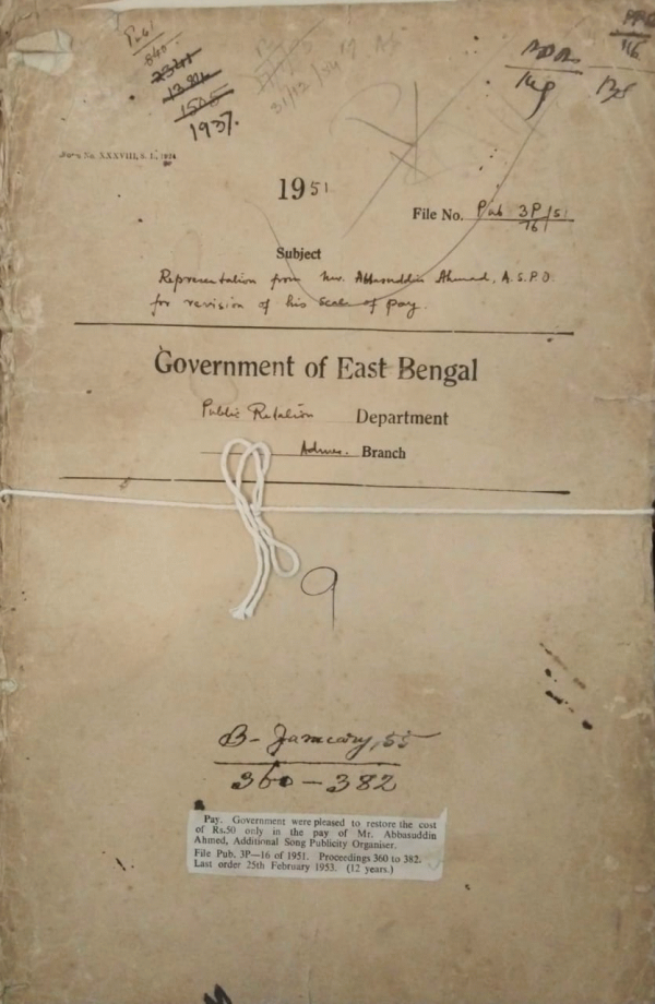 | Rack No. 18, Bundle No. 11, SI No. 691 Grant of house buildings advance to govt. servants. | Rack No. 18, Bundle No. 11, SI No. 692 Confirmation of Mvi. M.A. Wahed, as a L.D. Assistant under this Department. | Rack No. 18, Bundle No. 11, SI No. 693 Petition for the post of Record supplier. | Rack No. 18, Bundle No. 11, SI No. 694 Re-presentation from Mr. Abbasuddin Ahmed A.S.P.O. for revision of his scale of pay. | Rack No. 18, Bundle No. 11, SI No. 695 Fixation of pay of Dy. secretary Assistant and registers in the prescribed scale. | Rack No. 18, Bundle No. 11, SI No. 696 Exchange of views with other provincial govt. on common matters. | Rack No. 18, Bundle No. 11, SI No. 697 East Bengal subordinate services (Revision of pay) Rules, 1949. |