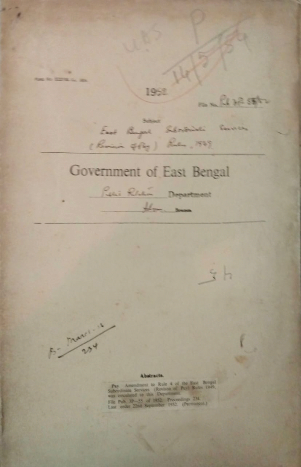 | Rack No. 18, Bundle No. 11, SI No. 694 Re-presentation from Mr. Abbasuddin Ahmed A.S.P.O. for revision of his scale of pay. | Rack No. 18, Bundle No. 11, SI No. 695 Fixation of pay of Dy. secretary Assistant and registers in the prescribed scale. | Rack No. 18, Bundle No. 11, SI No. 696 Exchange of views with other provincial govt. on common matters. | Rack No. 18, Bundle No. 11, SI No. 697 East Bengal subordinate services (Revision of pay) Rules, 1949. | Rack No. 18, Bundle No. 11, SI No. 698 Rules regarding disposal of temporary govt. servants by drawing departmental proceedings. | Rack No. 18, Bundle No. 11, SI No. 699 Fixation of pay of Mvi, Md. Osman Khan, Senior of the public relation Department. | Rack No. 18, Bundle No. 11, SI No. 700 Bearing authority for press Telegrams. |