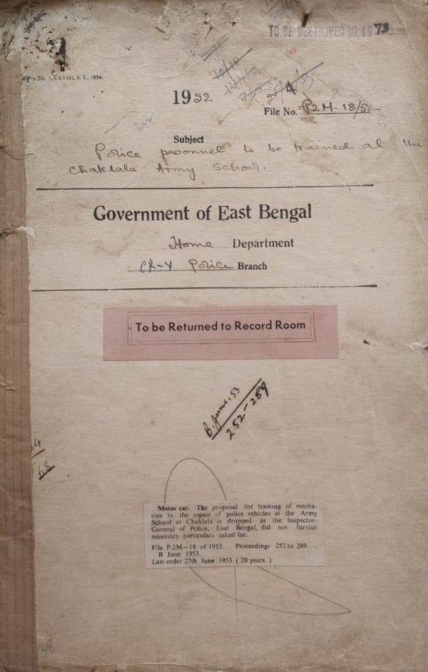 | Rack No. 29, Bundle No. 133, Sl No. 12254 Purchase of Cooking utensils for the E.P.R.’S. | Rack No. 29, Bundle No. 133, Sl No. 12255 Installation of a Telephone connection in the police and D.I.B office at Dinajpur. | Rack No. 29, Bundle No. 133, Sl No. 12256 Recovery of charges from other provinces of Pakistan for training of their P.S.P Probationers at the P.T.C Sordar. | Rack No. 29, Bundle No. 133, Sl No. 12257 Police Personnel to be trained at the Chaklata Army School. | Rack No. 29, Bundle No. 133, Sl No. 12258 Removed of Public women from Golak-Pal Lane Dacca. | Rack No. 29, Bundle No. 133, Sl No. 12259 Occasional breaks at the police Training College Sardah. | Rack No. 29, Bundle No. 133, Sl No. 12260 Return of fire arms and other weapons of the old Cooch Behar State |