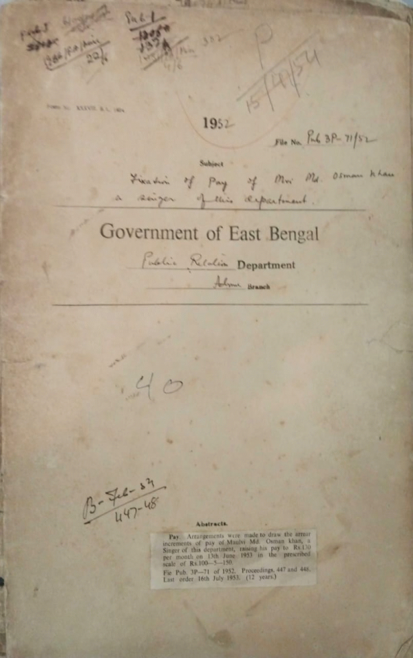 | Rack No. 18, Bundle No. 11, SI No. 696 Exchange of views with other provincial govt. on common matters. | Rack No. 18, Bundle No. 11, SI No. 697 East Bengal subordinate services (Revision of pay) Rules, 1949. | Rack No. 18, Bundle No. 11, SI No. 698 Rules regarding disposal of temporary govt. servants by drawing departmental proceedings. | Rack No. 18, Bundle No. 11, SI No. 699 Fixation of pay of Mvi, Md. Osman Khan, Senior of the public relation Department. | Rack No. 18, Bundle No. 11, SI No. 700 Bearing authority for press Telegrams. | Rack No. 18, Bundle No. 11, SI No. 701 Fixation of pay of Mvi, Abdul Mahboob an U.D. Assistant of this Department. | Rack No. 18, Bundle No. 11, SI No. 702 Remittance to India for family maintenance. |
