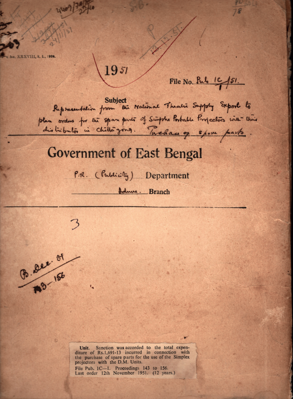 | Rack No. 18, Bundle No. 03, SI No. 214 Procedure for approval of Social uplift Scheme was Circulated to this Department. | Rack No. 18, Bundle No. 03, SI No. 215 Rules for the use of Govt, Aircraft. | Rack No. 18, Bundle No. 03, SI No. 216 Special rate of daily allowance for half at Dacca. | Rack No. 18, Bundle No. 03, SI No. 221 Sanction was accorded to the total expenditure of Rs. 1691-13 incurred in connection with the purchase of spare parts for the use of the Simple Projectors with the D.M. Units. | Rack No. 18, Bundle No. 03, SI No. 222 Appointment of Sub-Editors Assistant Director of Publicity and Assistant Editor (Journals). | Rack No. 18, Bundle No. 03, SI No. 223 Grant of advance to three press Representatives of East- Bengal to visit Karachi. | Rack No. 18, Bundle No. 03, SI No. 224 Funds for the working of the Districts and Sub- divisional Publicity units were sanctioned. |