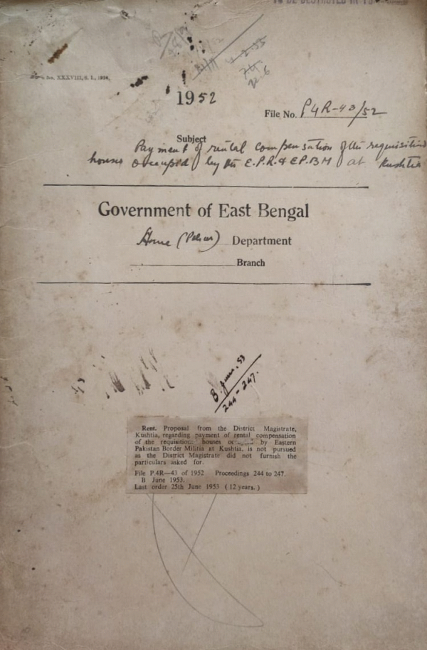| Rack No. 29, Bundle No. 133, Sl No. 12260 Return of fire arms and other weapons of the old Cooch Behar State | Rack No. 29, Bundle No. 133, Sl No. 12261 Fixation of pay of Calcutta police Personnel now serving in E. Bengal | Rack No. 29, Bundle No. 133, Sl No. 12262 Proposal for additional staff for border Police Vehicles. | Rack No. 29, Bundle No. 133, Sl No. 12263 Payment of rental Compensation requisitioned houses occupied by E.P.B.M at Khustia. | Rack No. 29, Bundle No. 133, Sl No. 12264 Notice under sanction 80C.P.C on behalf of dismissed constable No. 1039 Md. Abdus Salam of S.A.F Bakerganj to file a suit against Govt. if he is not re-instated. | Rack No. 29, Bundle No. 133, Sl No. 12265 Extra staff for E.P.R. establishment required in connecting with the work in I.G.S Reserve Stores. | Rack No. 29, Bundle No. 14, Sl No. 189 Proposal Commutation of the Plitical pension of Mehdi Begum Ahias. |