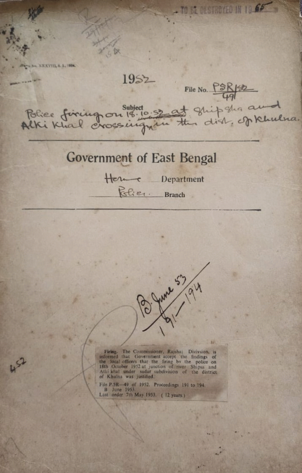 | Rack No. 25, Bundle No. 132, SI No. 12,236 Seizure of a gun belonging to Shri Hironlal Singh Roy by the government of East Bengal. | Rack No. 25, Bundle No. 132, SI No. 12,237 Extension of Sarai act (act no. XXII of 18679 to Chittagong Hill Tracts). | Rack No. 25, Bundle No. 132, SI No. 12,238 Addenda and Corrigenda to the P.R.B. 1943 for the quarter ending 31st December, 1952. | Rack No. 25, Bundle No. 133, Sl No. 12266 Police firing on 18.1052 at Shipsha and Alkikhal Crossing in the dist of Khulna. | Rack No. 25, Bundle No. 133, Sl No. 12267 Adjustment shortage in Cash and materials against govt. servants of Undivided Bengal on the date of Partition. | Rack No. 25, Bundle No. 133, Sl No. 12268 Medical Examination fee in respect of constables for E. Bengal Border Police. | Rack No. 25, Bundle No. 133, Sl No. 12269 Revision of rule 786A of P.R.B Vol-1 req. grant of first Kit allowance to cadet S.I on joining the police training college Sardhah. |