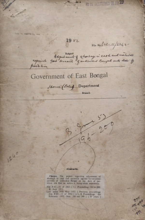 Adjustment shortage in Cash and materials against govt. servants of Undivided Bengal on the date of Partition.