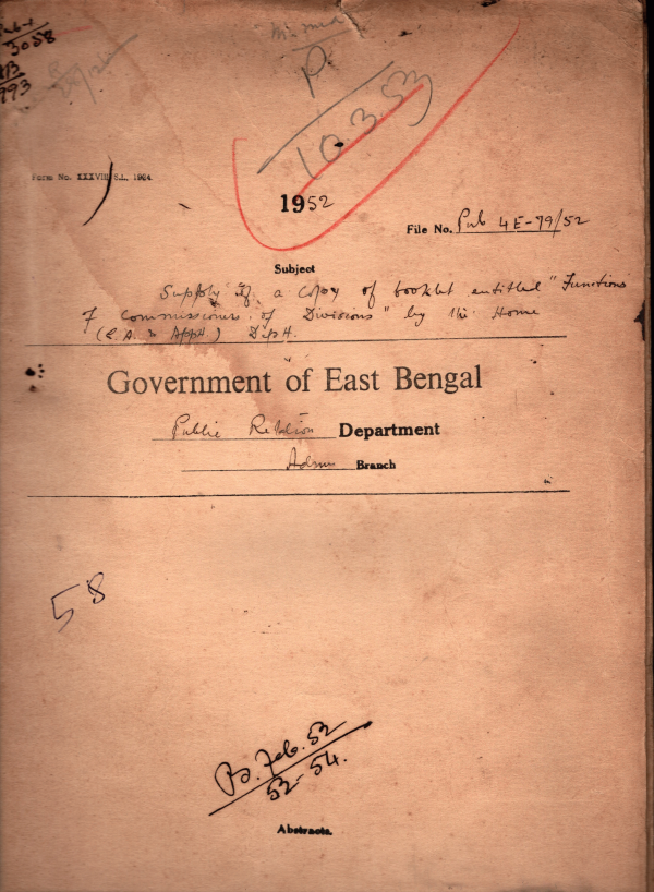 | Rack No. 18, Bundle No. 03, SI No. 227 Sanction was accorded for the expenditure of Rs. 153-13-6 only in connection with Preparation of some blacks by the East Ends process works. | Rack No. 18, Bundle No. 03, SI No. 228 Grant of house building advance to Mvi. Md. Mahmud Ali Mallick Head Assistant II of this Department. | Rack No. 18, Bundle No. 03, SI No. 229 Sanding of a copy of Specimen Signature of the officers Accountant General, East Bengal, | Rack No. 18, Bundle No. 03, SI No. 230 Functions of Commissioners of Division, Government of East Bengal, East Bengal | Rack No. 18, Bundle No. 03, SI No 191 Amendment to the B.S.R. post 1 &11. | Rack No. 18, Bundle No. 03, SI No 217 Issue of instruction of D.M. Unit Noakhali to worked at Feni. | Rack No. 18, Bundle No. 03, SI No 218 Arrangement for drawing one increment of pay of Maulvi Abdul Mahmood from 12th September 1947 was made with the Accounts Branch. |