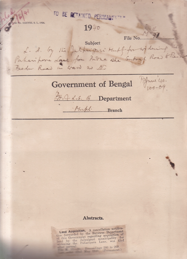 L.A. by the Jalpaiguri Municipality for widening the Paharipara Lane from Padma Shah Central Road in Ward no. III.