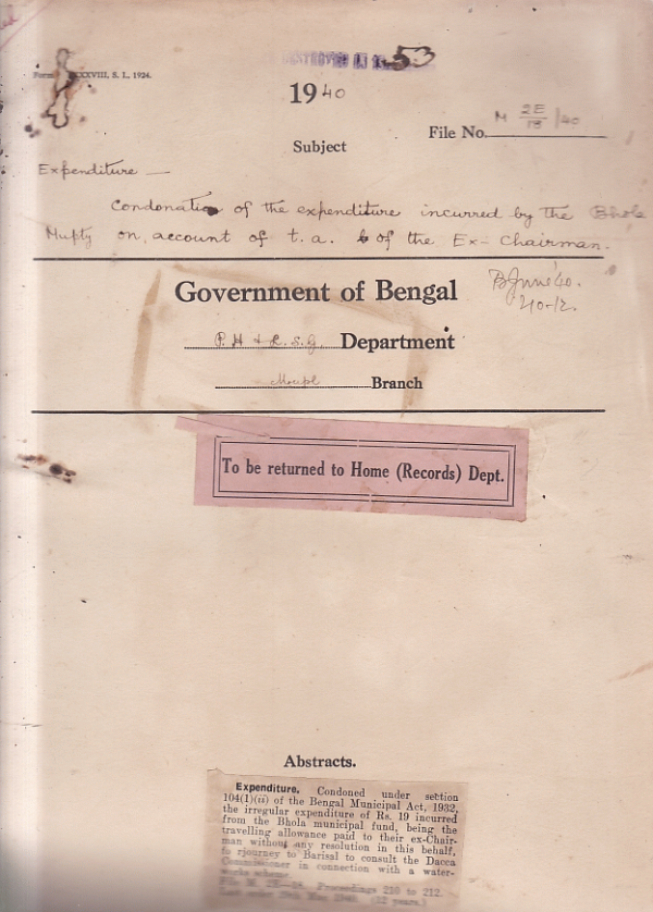 Condonation of the Expenditure incurred by the Bhola Municipality on account of T,A. of the Ex-chairman.