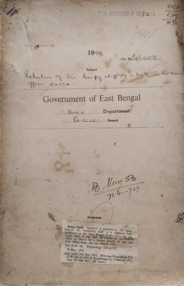 | Rack No. 25, Bundle No. 133, Sl No. 12278 Construction of a small investigating Centre with quarters at Companyganj P.S. in the district of Noakhali. | Rack No. 25, Bundle No. 133, Sl No. 12279 Inspection report on the accounts of the Sylhet Police Ration Store for the years 1947-48 to 1950-51. | Rack No. 25, Bundle No. 133, Sl No. 12280 Retention of the house fired for the accommodation of the Sadar Court Inspect. Mymensingh. | Rack No. 25, Bundle No. 133, Sl No. 12281 Retention of the temp. staff of 4 Assistant Sub-Inspectors in the East Bengal Police Force for the Reserve office at Dacca. | Rack No. 25, Bundle No. 133, Sl No. 12282 Payment of rent of Azimpur flats occupied by wireless operators of the East Pakistan Rifles. | Rack No. 25, Bundle No. 133, Sl No. 12283 Retention of the temp. staff in the Railway Police. | Rack No. 25, Bundle No. 133, Sl No. 12284 Requirement of “Asian Travel ways” |