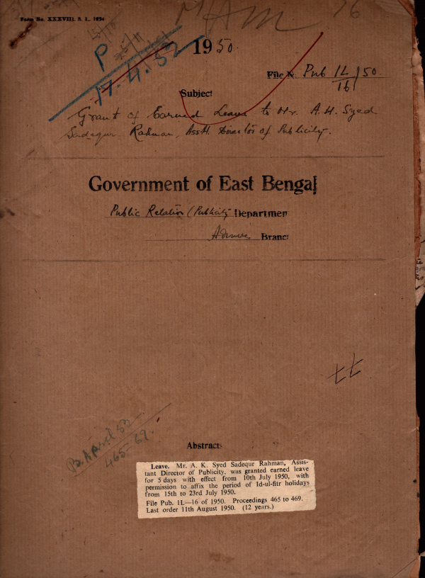 | Rack No. 18, Bundle No. 04, SI No. 238 Posting of Sub-divisional Publicity organizer for the newly created Sub- division of Newabganj. | Rack No. 18, Bundle No. 04, SI No. 239 Dismissal of Mvi. Shadat Hussain Khondokar from service and debarred from future employment under goverment. | Rack No. 18, Bundle No. 04, SI No. 240 House building advance of Mvi. Syed Azmal Ali Meerza a Permanent U.D. Assistant of the Public relation. | Rack No. 18, Bundle No. 04, SI No. 241 Grant of earned leave to Mr. A. H. Syed Sadequr Rahman, Assistant Director of Publicity. | Rack No. 18, Bundle No. 04, SI No. 242 Rules for the supply and use of Stationery Store. | Rack No. 18, Bundle No. 04, SI No. 243 Fixation of Stationary grants of the Department for this year 1950-51 | Rack No. 18, Bundle No. 04, SI No. 244 Supply of medicines to the district mobile unit. |