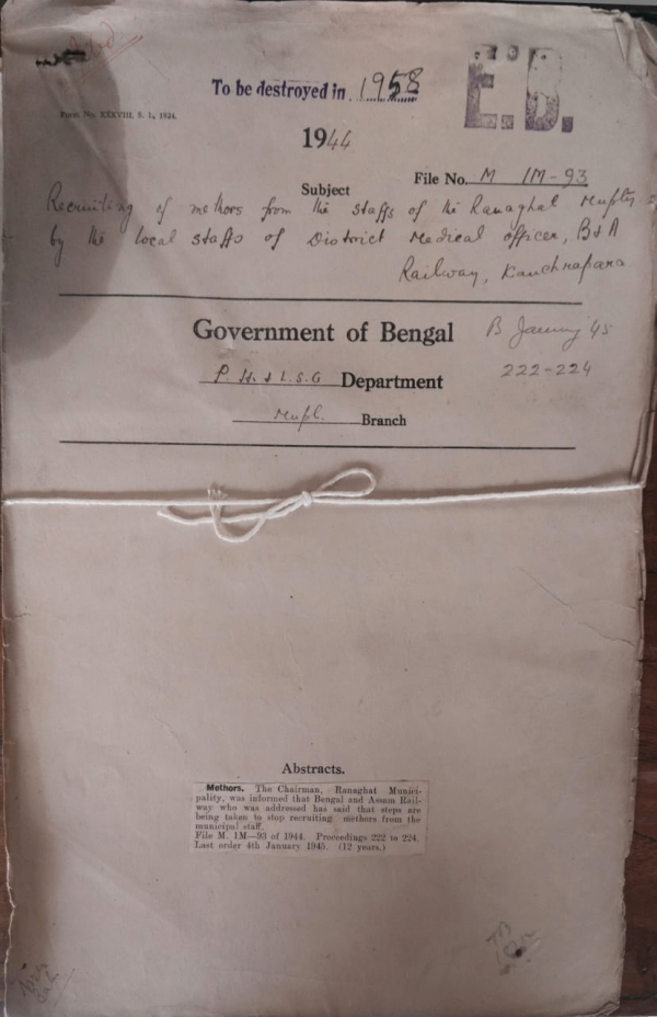 | Rack No. 13, Bundle No. 28, Sl No. 1943 Rules for pension and gratuities framed by the Serajganj Municipality. | Rack No. 13, Bundle No. 28, Sl No. 1944 Sanction for purchasing 12 mds. of rice at govt. controlled rate by the Nalcity Municipality. | Rack No. 13, Bundle No. 28, Sl No. 1945 Proposed revision of assessment of the Rajbari municipality before the expiry of the prescribed time. | Rack No. 13, Bundle No. 28, Sl No. 1946 Recruiting of methors from the staffs of the Ranughat Municipality by the Local Staffs of District Medical Officer, B & A Railway. | Rack No. 13, Bundle No. 28, Sl No. 1947 Condonation of expenditure incurred by the Mymensingh Municipality to pay the T.A. to the Ex-Chairman of the Municipality. | Rack No. 13, Bundle No. 28, Sl No. 1948 L.A. by the Jamalpur Municipality for extension of the Amlapara bye-road. | Rack No. 13, Bundle No. 28, Sl No. 1949 Notes of audit of accounts of the Chittagong Municipality for 1941-42. |