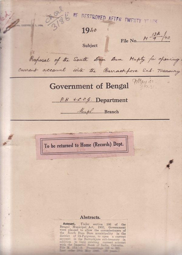 | Rack No. 13 , Bundle No. 19 , Sl No. 1284 Annulment of progs of the registering Authority Budge Budge Municipality. | Rack No. 13 , Bundle No. 19 , Sl No. 1285 Maintenance of a separate account of Govt. grants to the corporation of Calcutta. | Rack No. 13 , Bundle No. 19 , Sl No. 1286 Extension of the Calcutta Hackney Carriage Act of 1919 to certain Municipalities. | Rack No. 13 , Bundle No. 19 , Sl No. 1287 Proposal of South Dum Dum Municipality for opening a current account with the Barrackpore sub-treasury. | Rack No. 13 , Bundle No. 19 , Sl No. 1288 Question of Imposition of Municipal license fees or taxes by the Ranaghat Municipality on hotels. | Rack No. 13 , Bundle No. 19 , Sl No. 1289 Adoption of a bye-laws u/s 414(C) by the Jessore Municipality. | Rack No. 13 , Bundle No. 19 , Sl No. 1290 Sanction to the Payment of Contribution of Rs. 24/-to the Barrackpore S.P.C.A by the Commissions of the North Dum Dum Municipality. |