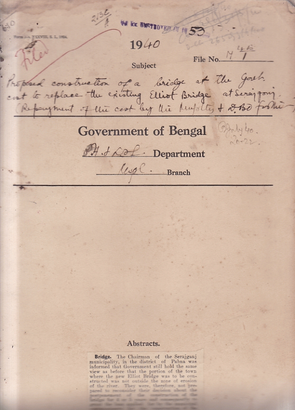 Proposed construction of a bridge at the govt. cost to repalce the existing Elliot Bridge Serajgonj.