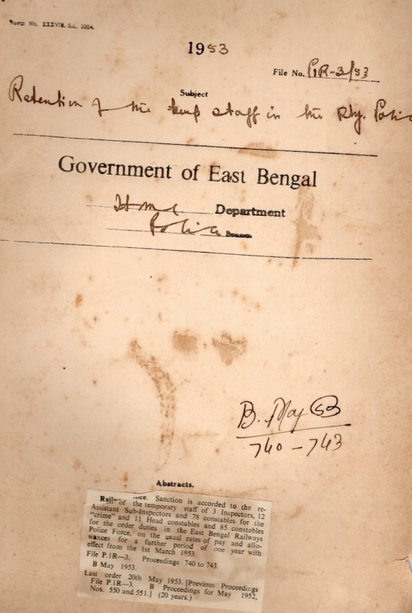 | Rack No. 25, Bundle No. 133, Sl No. 12280 Retention of the house fired for the accommodation of the Sadar Court Inspect. Mymensingh. | Rack No. 25, Bundle No. 133, Sl No. 12281 Retention of the temp. staff of 4 Assistant Sub-Inspectors in the East Bengal Police Force for the Reserve office at Dacca. | Rack No. 25, Bundle No. 133, Sl No. 12282 Payment of rent of Azimpur flats occupied by wireless operators of the East Pakistan Rifles. | Rack No. 25, Bundle No. 133, Sl No. 12283 Retention of the temp. staff in the Railway Police. | Rack No. 25, Bundle No. 133, Sl No. 12284 Requirement of “Asian Travel ways” | Rack No. 25, Bundle No. 133, Sl No. 12285 Permission to start a Lottery to Mvi. A. Khaleque Chowdhury, Honry. Secretary East Pakistan steamer Employees. | Rack No. 25, Bundle No. 133, Sl No. 12286 Construction of a barrack for Head Constables & Constables at Sakuni in the dist. of Faridpur. |