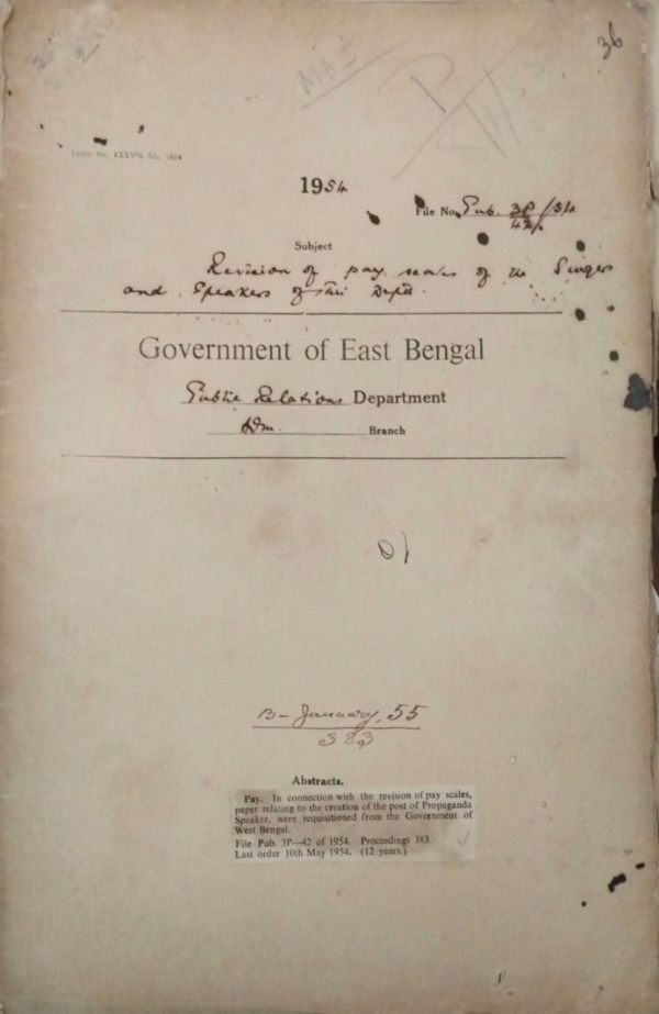 | Rack No. 18, Bundle No. 11, SI No. 721 Purchase of raw films for use during the year 1954-1955. | Rack No. 18, Bundle No. 11, SI No. 722 Grant of leave of Mr. Qazi Din Mahamad, A.D.P. | Rack No. 18, Bundle No. 11, SI No. 723 Purchase of equipment and accessories for the film unit. | Rack No. 18, Bundle No. 11, SI No. 724 Revision of the pay scales of the speakers of this Department. | Rack No. 18, Bundle No. 11, SI No. 725 Assignment of the life Insurance policy No.869376 of Mr. A. Hossain Dy. Director to the govt. of East Bengal. | Rack No. 18, Bundle No. 11, SI No. 726 Amendment to the rules for the Encouragement of the study of tribal languages in Bengal. | Rack No. 18, Bundle No. 11, SI No. 727 Instructions to the district Magistrate, Khulna regarding Obserbance of leave by the publicity staff. |