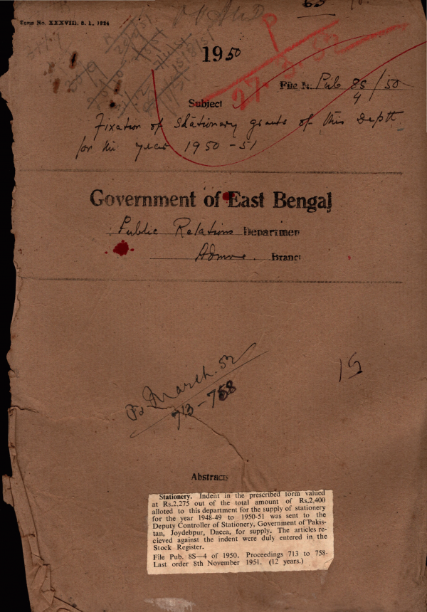 | Rack No. 18, Bundle No. 04, SI No. 240 House building advance of Mvi. Syed Azmal Ali Meerza a Permanent U.D. Assistant of the Public relation. | Rack No. 18, Bundle No. 04, SI No. 241 Grant of earned leave to Mr. A. H. Syed Sadequr Rahman, Assistant Director of Publicity. | Rack No. 18, Bundle No. 04, SI No. 242 Rules for the supply and use of Stationery Store. | Rack No. 18, Bundle No. 04, SI No. 243 Fixation of Stationary grants of the Department for this year 1950-51 | Rack No. 18, Bundle No. 04, SI No. 244 Supply of medicines to the district mobile unit. | Rack No. 18, Bundle No. 04, SI No. 245 Unauthorized absence of Nizamuddin Sk. orderly peon of D.P.O. Kushtia. | Rack No. 18, Bundle No. 04, SI No. 246 Fixation of pay of Mvi. Md, Mahmud Ali Mallik, U,D, Assistant of this Department in the Prescribed scale under E.B. Sub ordinate service (Revision of pay) Rules, 1949 |