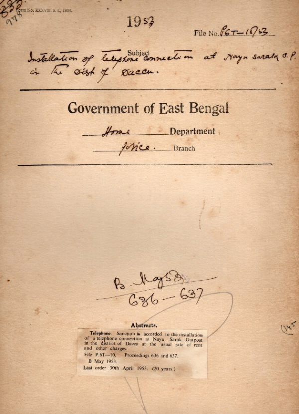 Installation of telephone connection at Naya Sarak Putpost in the dist. of Dacca.