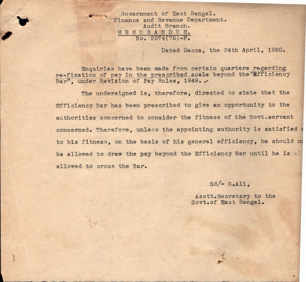Enquires have been made from certain quarters regarding re-fixation of pay in the prescribed scale beyond the " Efficiency Bar'' under Revision of pay Rules, 1949.