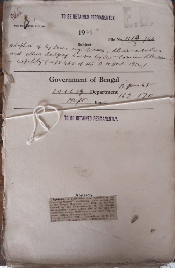 | Rack No. 13, Bundle No. 29, Sl No. 1962 A.Q. by Khan Bahaduti Haji Badi Ahmed, M.L.A, regarding supersession of the Chittagong Municipality. | Rack No. 13, Bundle No. 29, Sl No. 1963 Expenditure of Rs. 14-1-6 incurred by the Chokdah Municipality for meeting the contingency and other charges for the Chakdahe Town Food Committee. | Rack No. 13, Bundle No. 29, Sl No. 1964 Petition for suspension of the Pabna Municipality. | Rack No. 13, Bundle No. 29, Sl No. 1965 Adoption of bye-Laws regarding Sarais, dharamsalas and other lodging houses within the municipality. | Rack No. 13, Bundle No. 29, Sl No. 1966 Proposed postponement of revision of assessment of the Murshidabad Municipality. | Rack No. 13, Bundle No. 29, Sl No. 1967 Proposed amendment of Hackney Carriage Bye-Laws adopted by the Faridpur Municipality. | Rack No. 13, Bundle No. 29, Sl No. 1968 Adoption of model bye-laws regulating construction of buildings in less advanced municipalities. |