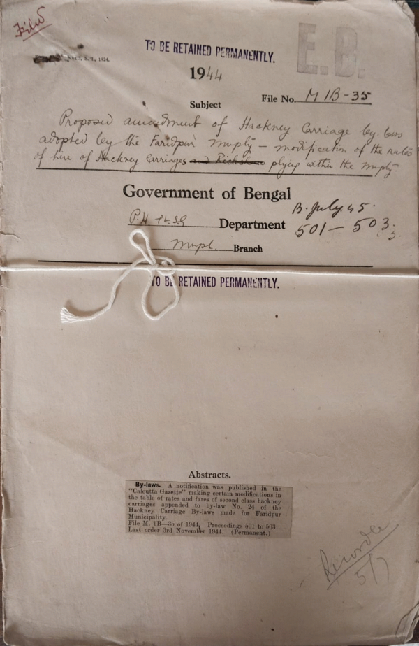 | Rack No. 13, Bundle No. 29, Sl No. 1964 Petition for suspension of the Pabna Municipality. | Rack No. 13, Bundle No. 29, Sl No. 1965 Adoption of bye-Laws regarding Sarais, dharamsalas and other lodging houses within the municipality. | Rack No. 13, Bundle No. 29, Sl No. 1966 Proposed postponement of revision of assessment of the Murshidabad Municipality. | Rack No. 13, Bundle No. 29, Sl No. 1967 Proposed amendment of Hackney Carriage Bye-Laws adopted by the Faridpur Municipality. | Rack No. 13, Bundle No. 29, Sl No. 1968 Adoption of model bye-laws regulating construction of buildings in less advanced municipalities. | Rack No. 13, Bundle No. 29, Sl No. 1969 Lease of land to the Pabna Municipality for a Moslem Girls School. | Rack No. 13, Bundle No. 29, Sl No. 1970 C.Q. by Khan Shahed Abdul Aziz regarding the member of dismissed employs of the Chittagong Municipality. |