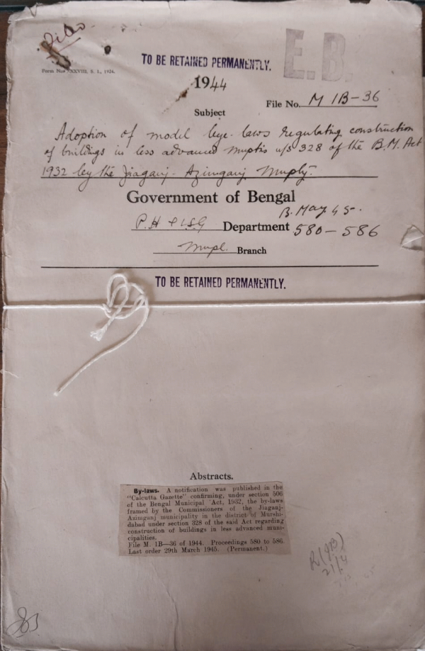 | Rack No. 13, Bundle No. 29, Sl No. 1965 Adoption of bye-Laws regarding Sarais, dharamsalas and other lodging houses within the municipality. | Rack No. 13, Bundle No. 29, Sl No. 1966 Proposed postponement of revision of assessment of the Murshidabad Municipality. | Rack No. 13, Bundle No. 29, Sl No. 1967 Proposed amendment of Hackney Carriage Bye-Laws adopted by the Faridpur Municipality. | Rack No. 13, Bundle No. 29, Sl No. 1968 Adoption of model bye-laws regulating construction of buildings in less advanced municipalities. | Rack No. 13, Bundle No. 29, Sl No. 1969 Lease of land to the Pabna Municipality for a Moslem Girls School. | Rack No. 13, Bundle No. 29, Sl No. 1970 C.Q. by Khan Shahed Abdul Aziz regarding the member of dismissed employs of the Chittagong Municipality. | Rack No. 13, Bundle No. 29, Sl No. 1971 Postponement of the revision of the Assessment list of the Bogra Municipality. |