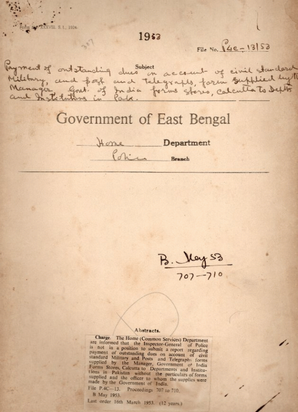 | Rack No. 25, Bundle No. 133, Sl No. 12291 Enquiry regarding the death of U.T. Prisoner Mofzul Hossain in Srinagar Thana Lock-Up of Dacca dist. | Rack No. 25, Bundle No. 133, Sl No. 12292 News print control order no 3 of 1953. | Rack No. 25, Bundle No. 133, Sl No. 12293 Supply of rations to a sub-insp. of the intelligence Bureau, Posted at Sylhet. | Rack No. 25, Bundle No. 133, Sl No. 12294 Payment of outstanding dues on account of civil standard Military and post and telegraphs, form supplied by the Manager, Government of India forms store, Calcutta to Depts. And Institutions in Pakistan. | Rack No. 25, Bundle No. 133, Sl No. 12295 Appropriation Accounts for 1951-52 relating to Grant No. 16 Major head 29 Police East Pakistan Ansars. | Rack No. 25, Bundle No. 133, Sl No. 12296 Exempting the Inspector Assessors of Civil Supplies Department from the necessity of taking out license for gun. | Rack No. 25, Bundle No. 133, Sl No. 12297 Deduction of income tax of source on Salaries. |