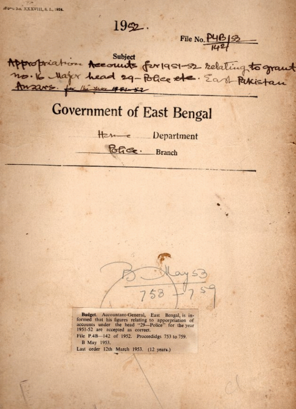 | Rack No. 25, Bundle No. 133, Sl No. 12292 News print control order no 3 of 1953. | Rack No. 25, Bundle No. 133, Sl No. 12293 Supply of rations to a sub-insp. of the intelligence Bureau, Posted at Sylhet. | Rack No. 25, Bundle No. 133, Sl No. 12294 Payment of outstanding dues on account of civil standard Military and post and telegraphs, form supplied by the Manager, Government of India forms store, Calcutta to Depts. And Institutions in Pakistan. | Rack No. 25, Bundle No. 133, Sl No. 12295 Appropriation Accounts for 1951-52 relating to Grant No. 16 Major head 29 Police East Pakistan Ansars. | Rack No. 25, Bundle No. 133, Sl No. 12296 Exempting the Inspector Assessors of Civil Supplies Department from the necessity of taking out license for gun. | Rack No. 25, Bundle No. 133, Sl No. 12297 Deduction of income tax of source on Salaries. | Rack No. 25, Bundle No. 133, Sl No. 12298 Retention of the temporary force for guarding the residence of the Hon’ble speaker E.B. Legislative Assemble. |
