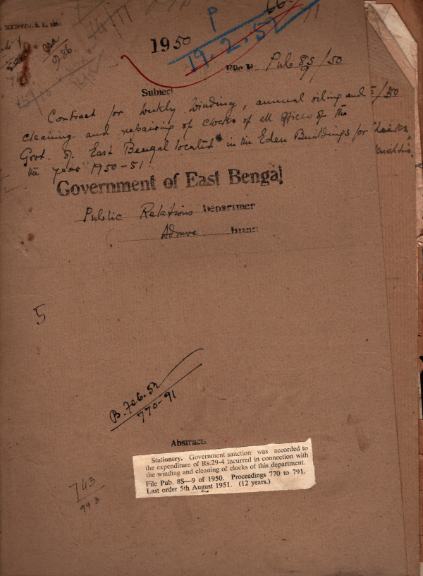 Contract for weekly winding annual oiling and cleaning and repairing of clocks of all officers of the govt. of East Bengal located in the Eden Building. Dacca for the year 1950-51