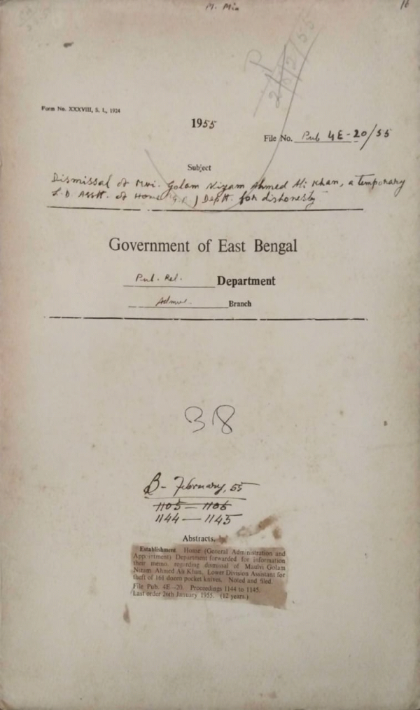| Rack No. 18, Bundle No. 11, SI No. 735 Partition stores belonging to the govt. of East Bengal deptt. of pub. relation. | Rack No. 18, Bundle No. 11, SI No. 736 Sale precedes of old newspapers of the District and sub-divisional publicity office. | Rack No. 18, Bundle No. 11, SI No. 737 Supply of films by the govt. of Pakistan for compulsory screening under the film scheme. | Rack No. 18, Bundle No. 11, SI No. 738 Dismissal of Mvi. Galam Nizam Ahmed Ali Khan, a temporary L.D. Asstt. of Home Deptt. for dishonesty. | Rack No. 18, Bundle No. 11, SI No. 739 Procedure for holding departmental enquiries. | Rack No. 18, Bundle No. 11, SI No. 740 Procedure of flash bulbs and roll films. | Rack No. 18, Bundle No. 12, SI No. 741 Amalgamation of the office of the Bengali transfer with the P.R.D. |