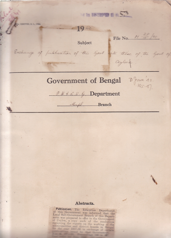 | Rack No. 13 , Bundle No. 19 , Sl No. 1294 Proposed construction of a bridge at the govt. cost to repalce the existing Elliot Bridge Serajgonj. | Rack No. 13 , Bundle No. 19 , Sl No. 1295 L.A. by the Bally Municipality B.T. Ganguli Road. | Rack No. 13 , Bundle No. 19 , Sl No. 1296 Expenditure of Rs. 105/- incurred by the Ramkibanpur Municipality on a/c of T.A. of the Chairman and the vice-chairman. | Rack No. 13 , Bundle No. 19 , Sl No. 1297 Exchange of publication of this govt. with those of the govt. of Ceylon. | Rack No. 13 , Bundle No. 19 , Sl No. 1298 Adoption of rule 5A of the model P.F Rules by the Tamluk Municipality. | Rack No. 13 , Bundle No. 19 , Sl No. 1299 Adoption by laws u/s 245(a) (b) of the B.M Act by the Jalpaiguri Municipality. | Rack No. 13 , Bundle No. 19 , Sl No. 1300 Sanction to the Expenditure of Rs. 40/- incurred by the Noakhali Municipality on the occasion of the Honorable Ministers visit to Noakhali. |