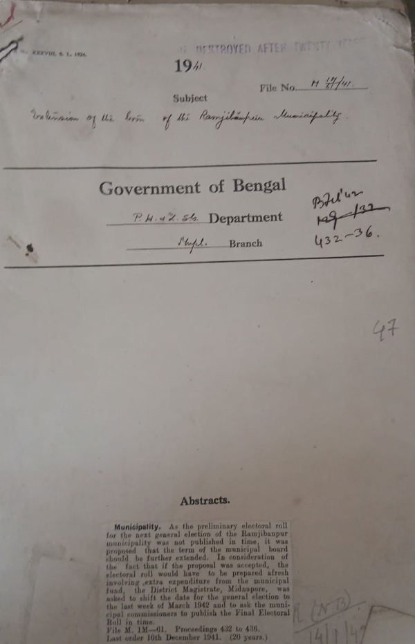 | Rack No. 13, Bundle No. 23, Sl No. 1544 Adoption of Model Rules, of Business by the Kurseng Municipality. | Rack No. 13, Bundle No. 23, Sl No. 1545 Proposed re-distribution of elected seats in the different wards of the Burdwan Municipality. | Rack No. 13, Bundle No. 23, Sl No. 1546 Proposed extension of term of the Serampore Municipality. | Rack No. 13, Bundle No. 23, Sl No. 1547 Extension of the term of Municipality. | Rack No. 13, Bundle No. 23, Sl No. 1548 Journal relating to Municipalities and Election. | Rack No. 13, Bundle No. 23, Sl No. 1549 Condonation of break in the Service of Babu Benoy Krishna Chongdar Compounder of the Baranagar Municipal Charitable Dispensary. | Rack No. 13, Bundle No. 23, Sl No. 1550 Extension of Secs. 225-29 of the B.M. Act, 1932 to the Baidyabati Municipality. |