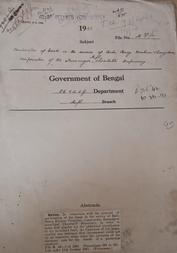 Condonation of break in the Service of Babu Benoy Krishna Chongdar Compounder of the Baranagar Municipal Charitable Dispensary.