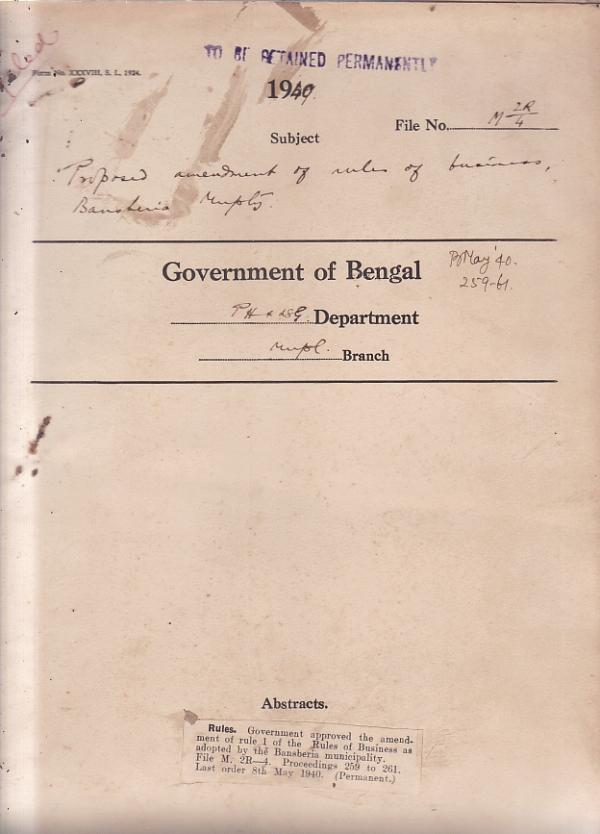 | Rack No. 13 , Bundle No. 19 , Sl No. 1311 Rule Continuance of additional pension to mail pensioners of tjhe Calcata Corporation. | Rack No. 13 , Bundle No. 19 , Sl No. 1312 Expenditure incurred by the kamarial Municipality for taking precautionary measures at the time of Lunar ecipses in 1938-1930. | Rack No. 13 , Bundle No. 19 , Sl No. 1313 LA. by the Chittagong Municipality for division of Fakirhat Road in the village of Gosalidanga | Rack No. 13 , Bundle No. 19 , Sl No. 1314 Proposed amendment of rules of business na Bane baria Municipality. | Rack No. 13 , Bundle No. 19 , Sl No. 1315 L.A. by the Bhadreswar Municipality for the extension of the play ground in the village of Bhadreswar. | Rack No. 13 , Bundle No. 19 , Sl No. 1316 Declaration of Zakaria Street as a main through fare of immoral Traffic Act. | Rack No. 13 , Bundle No. 19 , Sl No. 1317 Electric installation at the new fire brigade Headquarters. |