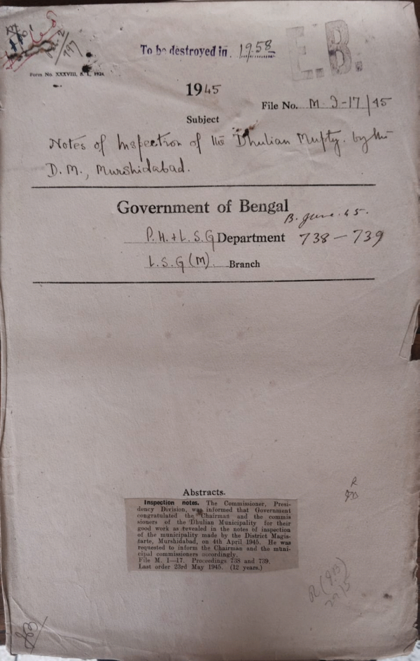 | Rack No. 13, Bundle No. 29, Sl No. 1979 L.A. by the Comilla Municipality for widening and extending the Kandipur lane No. III to join Rammala Road in Kandirpar, Comilla. | Rack No. 13, Bundle No. 29, Sl No. 1980 Proposed postponement of revision of assessment of the Noakhali Municipality. | Rack No. 13, Bundle No. 29, Sl No. 1981 Postponement of revision of the Kumar Khali Municipality. | Rack No. 13, Bundle No. 29, Sl No. 1982 Notes of Inspection of the Dhulian Municipality by the D.M. Murshidabad. | Rack No. 13, Bundle No. 29, Sl No. 1983 Inspection note of the Murshidabad Municipality. | Rack No. 13, Bundle No. 29, Sl No. 1984 Proposed increment of taxation on the Valuation of the Place of business of the Tangail Municipality. | Rack No. 13, Bundle No. 29, Sl No. 1985 Transfer of Certain roads, lands etc. to the Narayanganj |