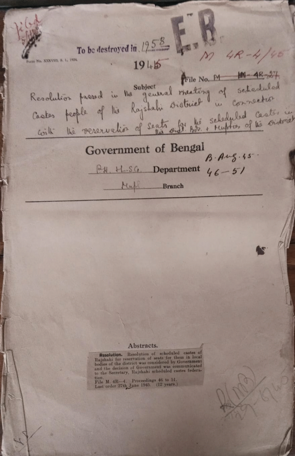 Resolution passed in the general meeting of Scheduled casts people of the Rajshahi District in connection with the reservation of seats for the Scheduled cast in the District Boards & Municipalities of the District.