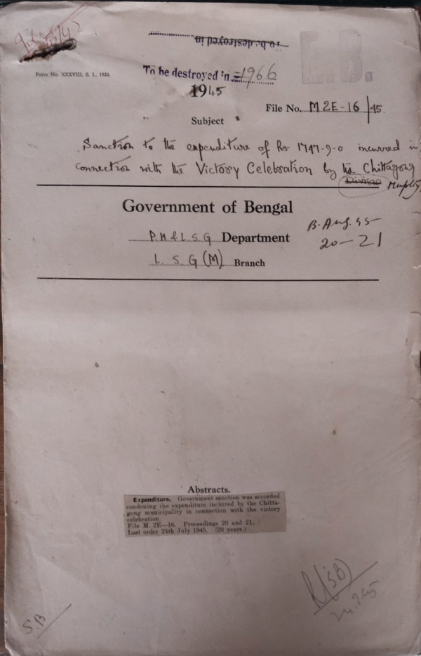 Sanction to the expenditure of 1747-9-0 incurred in connection with the victory celebration by Chittagong Municipality.