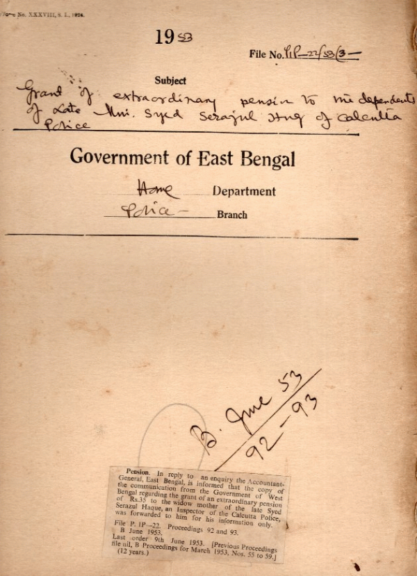 Grant of an extraordinary pension to the dependants of the late Mvi. Syed Sera Jul Haque of the Calcutta Police.