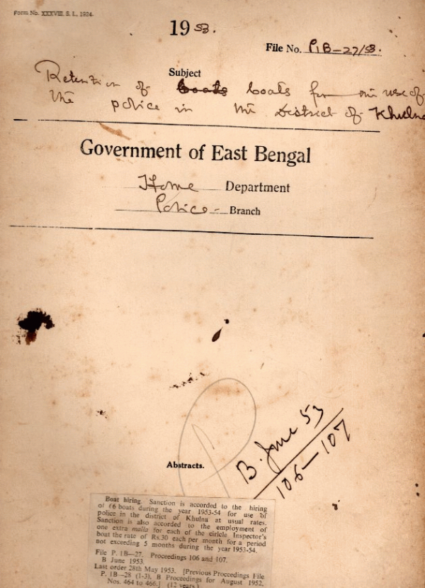 | Rack No. 25, Bundle No. 133, Sl No. 12321 Grant of an extraordinary pension to the dependants of the late Mvi. Syed Sera Jul Haque of the Calcutta Police. | Rack No. 25, Bundle No. 133, Sl No. 12322 Adjustment of hire Charge of M.T. Supplied to the wing commander 5 wing E.P.R. by the Army. | Rack No. 25, Bundle No. 133, Sl No. 12323 Statement showing the amount of advance pay and T.A. granted by the Government of East Bengal after partition to Govt. Servant transferred to Assam on option. | Rack No. 25, Bundle No. 133, Sl No. 12324 Retention of boats for the use of the police in the District of Khulna. | Rack No. 25, Bundle No. 133, Sl No. 12325 Memorial from Mr. Abdur Rashid Khan a dismissed Sub-inspector of Police, Khulna. | Rack No. 25, Bundle No. 133, Sl No. 12326 Sanction to the purchase of a portable type writer for the office of the Deputy I.G. of Border Police. | Rack No. 25, Bundle No. 133, Sl No. 12327 Renewal of gun licenses of Thakurgaon Sub-Divisional in the District of Dinajpur. |