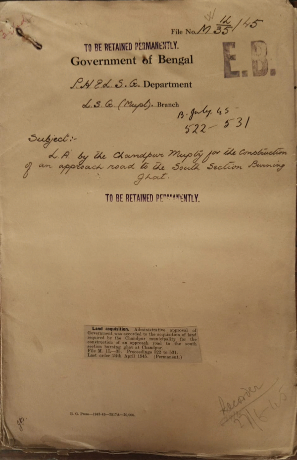 | Rack No. 13, Bundle No. 29, Sl No. 1988 Sanction to the expenditure of 1747-9-0 incurred in connection with the victory celebration by Chittagong Municipality. | Rack No. 13, Bundle No. 29, Sl No. 1989 Proposed postponement of revision of assessment of the Bajitpur Municipality. | Rack No. 13, Bundle No. 29, Sl No. 1990 Proposed surrender of unspent balance of the Loan of Rs. 30,000/ taken by the Jessore Municipality for the improvement of Roads. | Rack No. 13, Bundle No. 29, Sl No. 1991 L.A. by the Chandpur Municipality for the construction of an approach road to the south section Burning Ghat. | Rack No. 13, Bundle No. 29, Sl No. 1992 Proposed extension of Calcutta Hackney Carriage Act, 1919 to the English Bazar Municipality. | Rack No. 13, Bundle No. 29, Sl No. 1993 Postponement of revision of assessment of the Muktagacha Municipality in the Dacca Division. | Rack No. 13, Bundle No. 29, Sl No. 1994 Proposed suppression of the commissioners of the Barisal Municipality. |