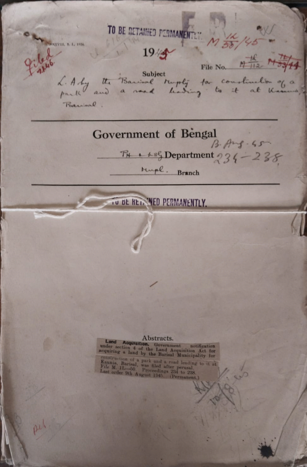 | Rack No. 13, Bundle No. 29, Sl No. 1993 Postponement of revision of assessment of the Muktagacha Municipality in the Dacca Division. | Rack No. 13, Bundle No. 29, Sl No. 1994 Proposed suppression of the commissioners of the Barisal Municipality. | Rack No. 13, Bundle No. 29, Sl No. 1995 L.A. by the Chandpur Municipality for an approach road to Ferry Ghat From Roy's Road. | Rack No. 13, Bundle No. 29, Sl No. 1996 L.A. by the Barisal Municipality for construction of a park and a road leading to it at Kaunia, Barisal. | Rack No. 13, Bundle No. 29, Sl No. 1997 L.A. by the Rajshahi Municipality for the construction of a Zenaza Prayer rear Ticeapara burial ground. | Rack No. 13, Bundle No. 29, Sl No. 1998 Proposed writing off at the amount of Rs.2.577/12/4 at Mymensingh Municipality defalcated by the late Asset; Account of the municipality. | Rack No. 13, Bundle No. 29, Sl No. 1999 L.A.by the Chandpur municipality for extent of the Burial ground of the North section of the Chandpur municipality. |