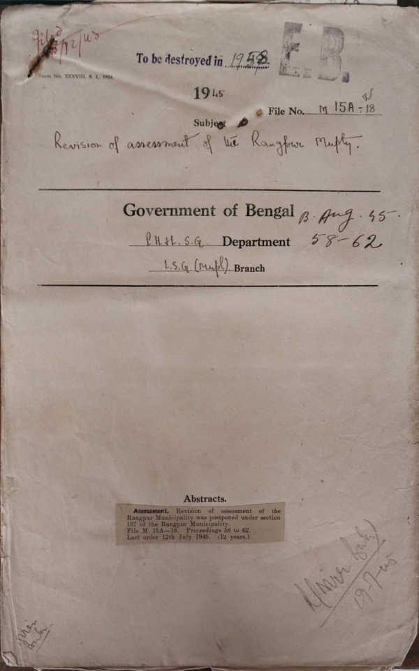| Rack No. 13, Bundle No. 29, Sl No. 1997 L.A. by the Rajshahi Municipality for the construction of a Zenaza Prayer rear Ticeapara burial ground. | Rack No. 13, Bundle No. 29, Sl No. 1998 Proposed writing off at the amount of Rs.2.577/12/4 at Mymensingh Municipality defalcated by the late Asset; Account of the municipality. | Rack No. 13, Bundle No. 29, Sl No. 1999 L.A.by the Chandpur municipality for extent of the Burial ground of the North section of the Chandpur municipality. | Rack No. 13, Bundle No. 29, Sl No. 2000 Revision of assessment of the Rangpur Municipality. | Rack No. 13, Bundle No. 29, Sl No. 2001 J.A by the Rarisal Municipality for widening the Bazar Road Junction with thana road. | Rack No. 13, Bundle No. 29, Sl No. 2002 Notes of inspection of the Tangail Municipality, by A.D.M, Mymensingh. | Rack No. 13, Bundle No. 29, Sl No. 2003 Notes of Inspection of the Netrokona Municipality. |