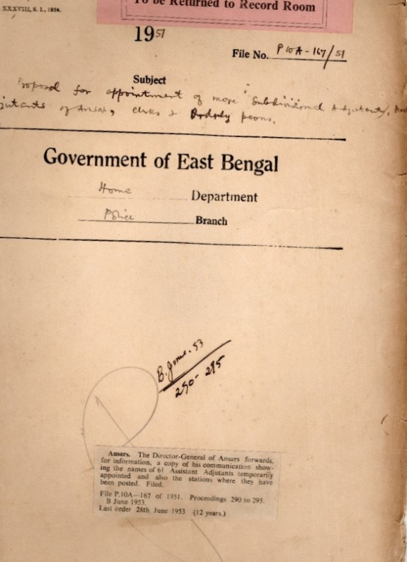 | Rack No. 25, Bundle No. 134, Sl No. 12341 Community Development Cum Agricultural Extension Programme. | Rack No. 25, Bundle No. 134, Sl No. 12342 Acquisition of land for construction of Thana-Cum Barrack buildings at Domar .S with Staff quarters in the District of Rangpur. | Rack No. 25, Bundle No. 134, Sl No. 12343 Proposal for sanction at Extra allowance for nursing orderlies of the Police hospitals, East Bengal. | Rack No. 25, Bundle No. 134, Sl No. 12344 Proposal for appointment of more sub divisional Adjutants Assistant Adjutants of Ansars and Clerks and Orderly Peons. | Rack No. 25, Bundle No. 134, Sl No. 12345 Delegation of Powers to indenters for direct purchase | Rack No. 25, Bundle No. 134, Sl No. 12346 Subscription to Police Journals of Foreign Countries for use in the P.T.C Sardah. | Rack No. 25, Bundle No. 134, Sl No. 12347 Question of adjustment of the earned leave of the Assistant concerned against his leave accounts is dropped. |