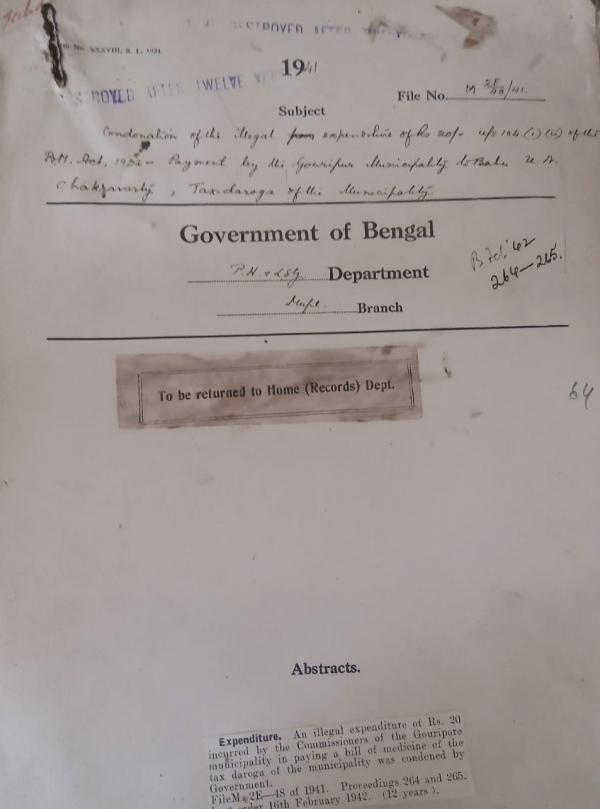 | Rack No. 13, Bundle No. 23, Sl No. 1561 Presentation of address to H/E, the Governor of Bengal by the Rajshahi Municipality. | Rack No. 13, Bundle No. 23, Sl No. 1562 Appointment of Arbitrators for the Calcutta Improvement trust Scheme No. XLII. | Rack No. 13, Bundle No. 23, Sl No. 1563 Financial position of the Rangpur Municipality. | Rack No. 13, Bundle No. 23, Sl No. 1564 Condonation of the illegal expenditure of Rs. 20/- u/s 104 (i) (ii) of the B.M. Act. 1932 payment by the Gouripur Municipality to Babu U.N. Chakravarty | Rack No. 13, Bundle No. 23, Sl No. 1565 L.A. by the Kishorganj Municipality to widening the approach road to Janada Sundari Pridge. | Rack No. 13, Bundle No. 23, Sl No. 1566 Slaughter of live-stock during the year 1940-41. | Rack No. 13, Bundle No. 23, Sl No. 1567 Acting appointment of Mr. J.A. Parks as Chief Valuer C.I. Trust. |
