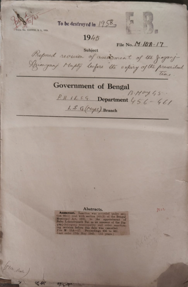 | Rack No. 13, Bundle No. 29, Sl No. 2006 Report on the working of municipalities in the Rajshahi Division for the year 1940-41. | Rack No. 13, Bundle No. 29, Sl No. 2007 Report on the working of Municipality in the Dacca Division for the year 1940-41. | Rack No. 13, Bundle No. 29, Sl No. 2008 Notes of inspection of the Jessore Municipality. | Rack No. 13, Bundle No. 29, Sl No. 2009 Report revision of assessment of the Jiaganj Azimganj Municipality before the expiry of the prescribed time. | Rack No. 13, Bundle No. 29, Sl No. 2010 Overdraft of Rs.1.00000-by the Dacca Municipality from the Imperial/Bank of India | Rack No. 13, Bundle No. 29, Sl No. 2011 Extension of the provisions of Schedule "of the B.M.Act, 1932 to the Barisal Municipality. | Rack No. 13, Bundle No. 29, Sl No. 2012 Conservancy taxes on Govt. Buildings outside Municipal limits New Civil Station, Dacca agreement with the Dacca Municipality. |