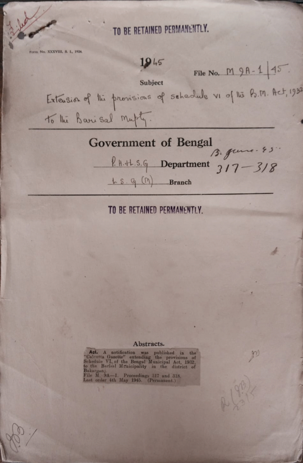 | Rack No. 13, Bundle No. 29, Sl No. 2008 Notes of inspection of the Jessore Municipality. | Rack No. 13, Bundle No. 29, Sl No. 2009 Report revision of assessment of the Jiaganj Azimganj Municipality before the expiry of the prescribed time. | Rack No. 13, Bundle No. 29, Sl No. 2010 Overdraft of Rs.1.00000-by the Dacca Municipality from the Imperial/Bank of India | Rack No. 13, Bundle No. 29, Sl No. 2011 Extension of the provisions of Schedule "of the B.M.Act, 1932 to the Barisal Municipality. | Rack No. 13, Bundle No. 29, Sl No. 2012 Conservancy taxes on Govt. Buildings outside Municipal limits New Civil Station, Dacca agreement with the Dacca Municipality. | Rack No. 13, Bundle No. 29, Sl No. 2013 Measure to prevent unnecessary postponement of revision of assessment of Municipalities. | Rack No. 13, Bundle No. 29, Sl No. 2014 Sanction to the expenditure of Rs. 100/- incurred by the Comilla Municipality in respect of payment to the Beggars Concentration Camp. |