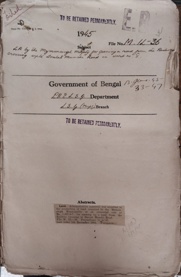 L.A. by the Mymensingh Municipality for opening a road from the Railway crossing upto Doulat Munchi Road in ward No. V.