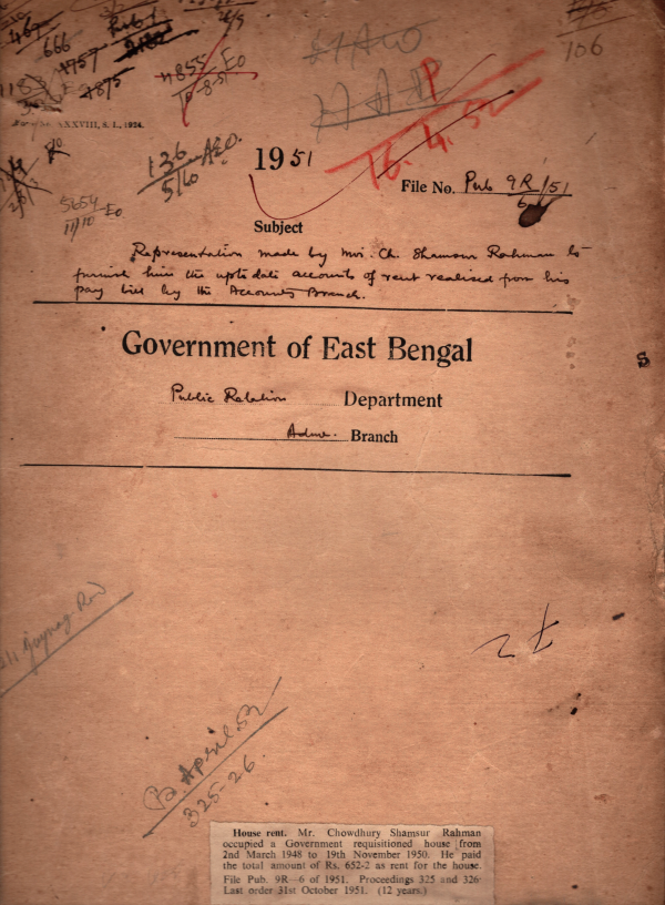 | Rack No. 18, Bundle No. 04, SI No. 303 Draft introduction to Development Schemes. | Rack No. 18, Bundle No. 04, SI No. 304 Grant of leave to Driver of D.M. Units. | Rack No. 18, Bundle No. 04, SI No. 305 Grant of the allowance to Panchu Sheikh, a peon of the D.M. unit, Jessore for over staying at Dacca. | Rack No. 18, Bundle No. 04, SI No. 306 Representation made by him Mvi. Mr. Chowdhury Shamsur to him the up to date account of rent realized from his pay live by the Accounts Branch. | Rack No. 18, Bundle No. 04, SI No. 307 Purchase of motor accessories. | Rack No. 18, Bundle No. 04, SI No. 308 Increment of pay of Md. Mansur Ali, a record supplier of this Department. | Rack No. 18, Bundle No. 04, SI No. 309 Revision of pay scales of non-gazetted employee of East Bengal govt. |