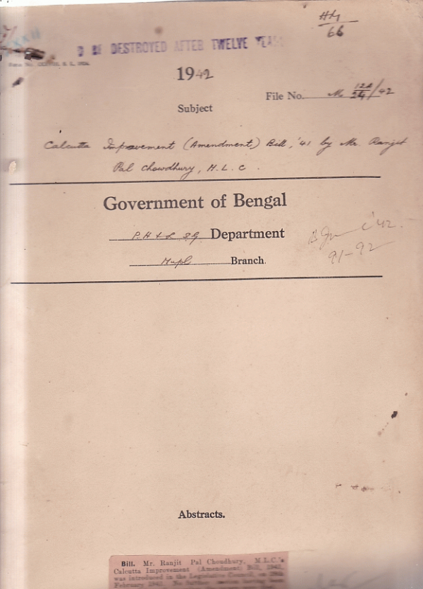 | Rack No. 13 , Bundle No. 25 , Sl No. 1679 Loan of Rs. 5000/- by the Tamluk Municipalitry for remodeling of the Municipal Market. | Rack No. 13 , Bundle No. 25 , Sl No. 1680 Annual Report on the working of the Muktagacha Municipality for the year 1941-42 | Rack No. 13 , Bundle No. 25 , Sl No. 1681 L.A. by the Comilla Municipality for widening the lane called BaJrapur lane joining Monoharpur roas with Chaulhatta road. | Rack No. 13 , Bundle No. 25 , Sl No. 1682 Calcutta improvement Bill, 41 by Mr. Ranjit Pal Chawdhury , M.L.C. | Rack No. 13 , Bundle No. 25 , Sl No. 1683 L.A. Rishra-Lonnagar Municipality for opening a new lane to meet the existing lane in the village of Mahesh. | Rack No. 13 , Bundle No. 25 , Sl No. 1684 Dearness allowance to the peon of the Muhammedan burial Board | Rack No. 13 , Bundle No. 25 , Sl No. 1685 Installation of a telephone connection at the residence of the special officer , civil defence , P.H. and L.S.G Department. |