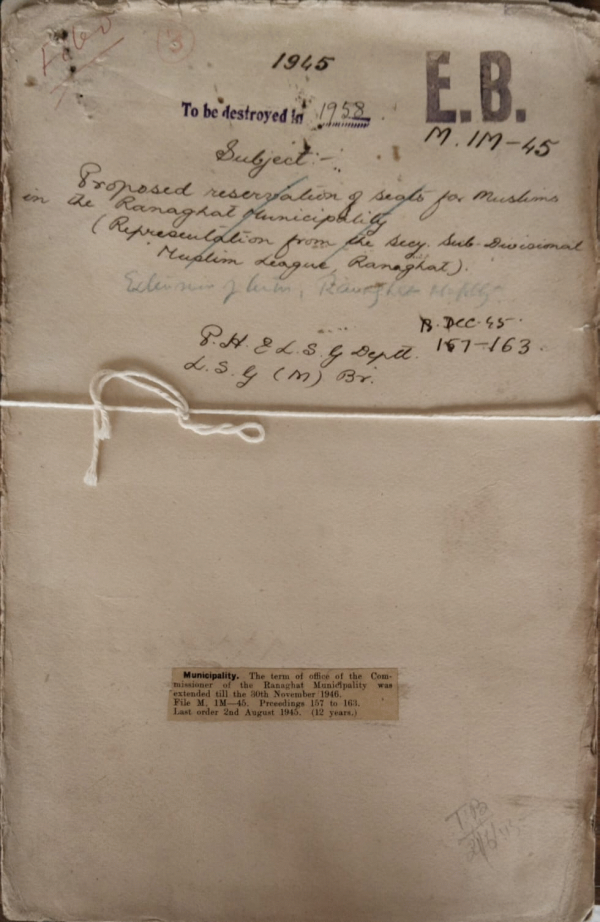 | Rack No. 13, Bundle No. 30, Sl No. 2026 Report on the working of the English Bazar Municipality for the year 1943-44. | Rack No. 13, Bundle No. 30, Sl No. 2027 L.A. by the Barisal Municipality for improvement of the Duani daily market and for widening the Bazar road and Duftarkhana road. | Rack No. 13, Bundle No. 30, Sl No. 2028 Reconstitution Sherpur Municipality (Mymensingh). | Rack No. 13, Bundle No. 30, Sl No. 2029 Proposed reservation of Seats for Muslims in the Ranaghat Municipality. | Rack No. 13, Bundle No. 30, Sl No. 2030 Reconstitution of the Mymensingh Municipality. | Rack No. 13, Bundle No. 30, Sl No. 2031 Adoption by the Narayanganj Municipality of Model Rules for the grant of gratuity to inferior Servants of Local bodies. | Rack No. 13, Bundle No. 30, Sl No. 2032 Proposal extension of the term of office of the commissioners of the Kotchandpur Municipality. |